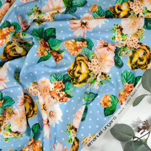 Satin de soie imprimé rosier à pois fond ciel