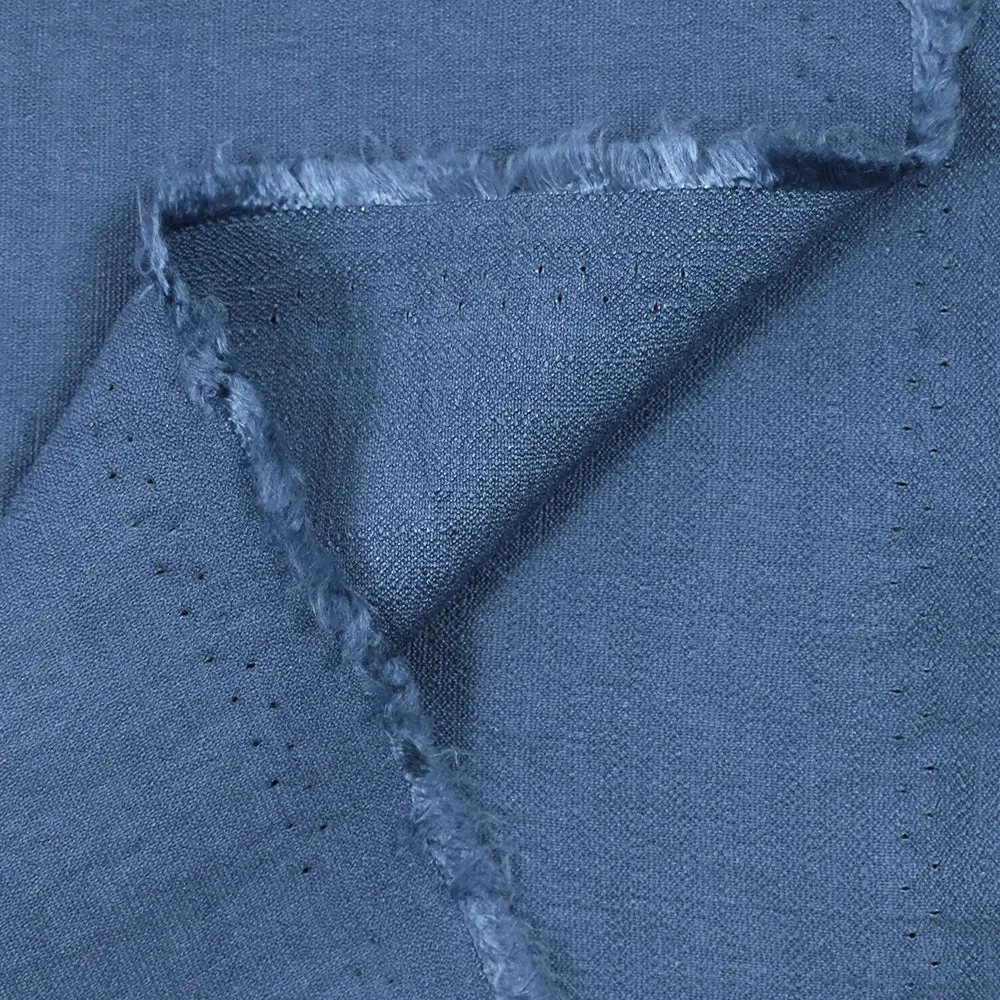 C’est un tissu crêpe composé principalement de viscose avec un peu de nylon. Il est souple, fluide, pas trop lourd et résistant avec un tissage original marqué par des petites irrégularités. Il est également légèrement froissé comme le lin ou la double gaze.