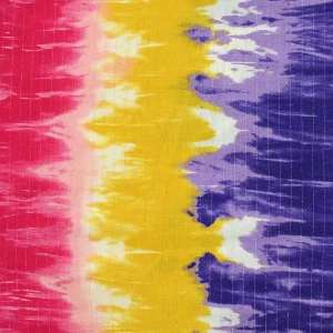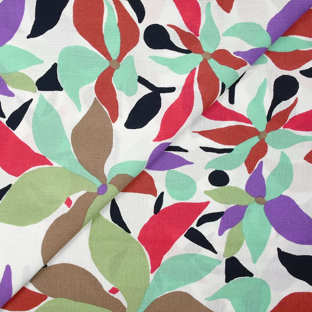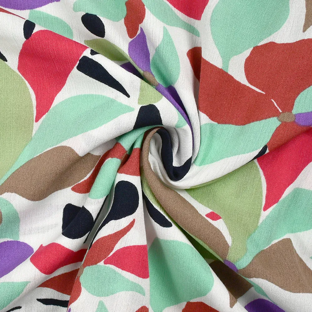 Crépon composé de viscose. C’est un tissu texturé avec un très beau tombé fluide. De poids léger, souple, fin, légèrement transparent et agréable avec un joli motif floral coloré.