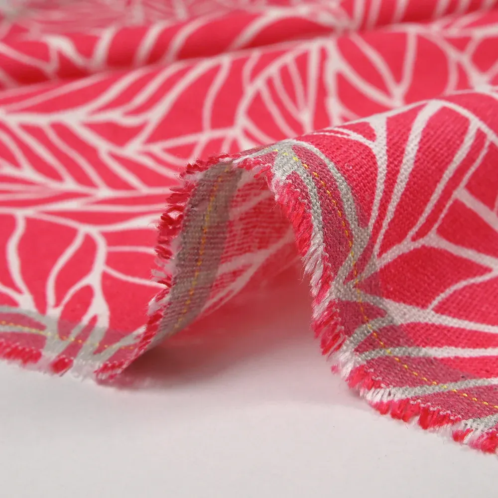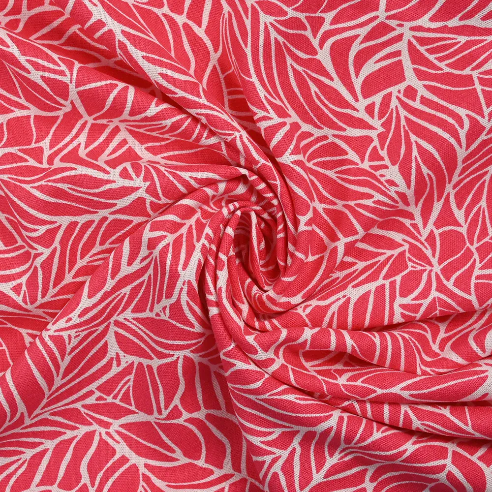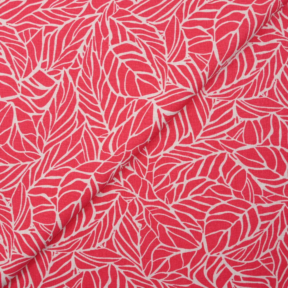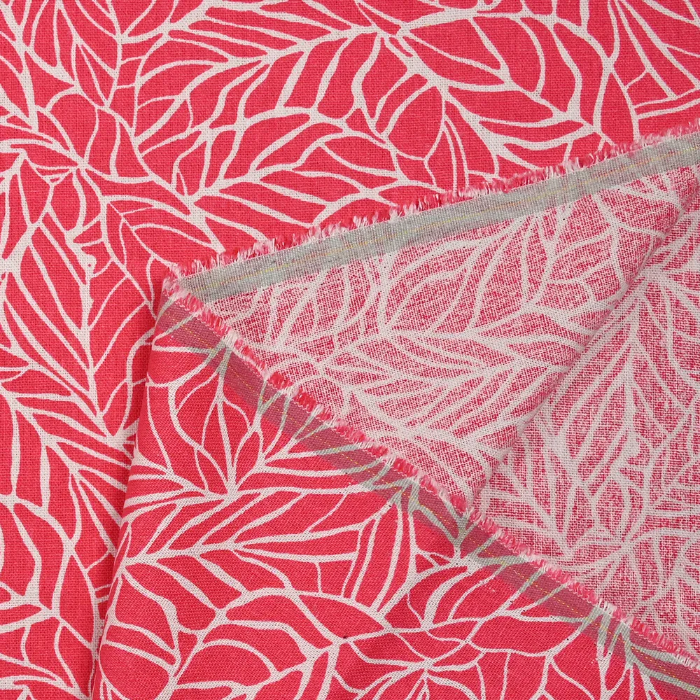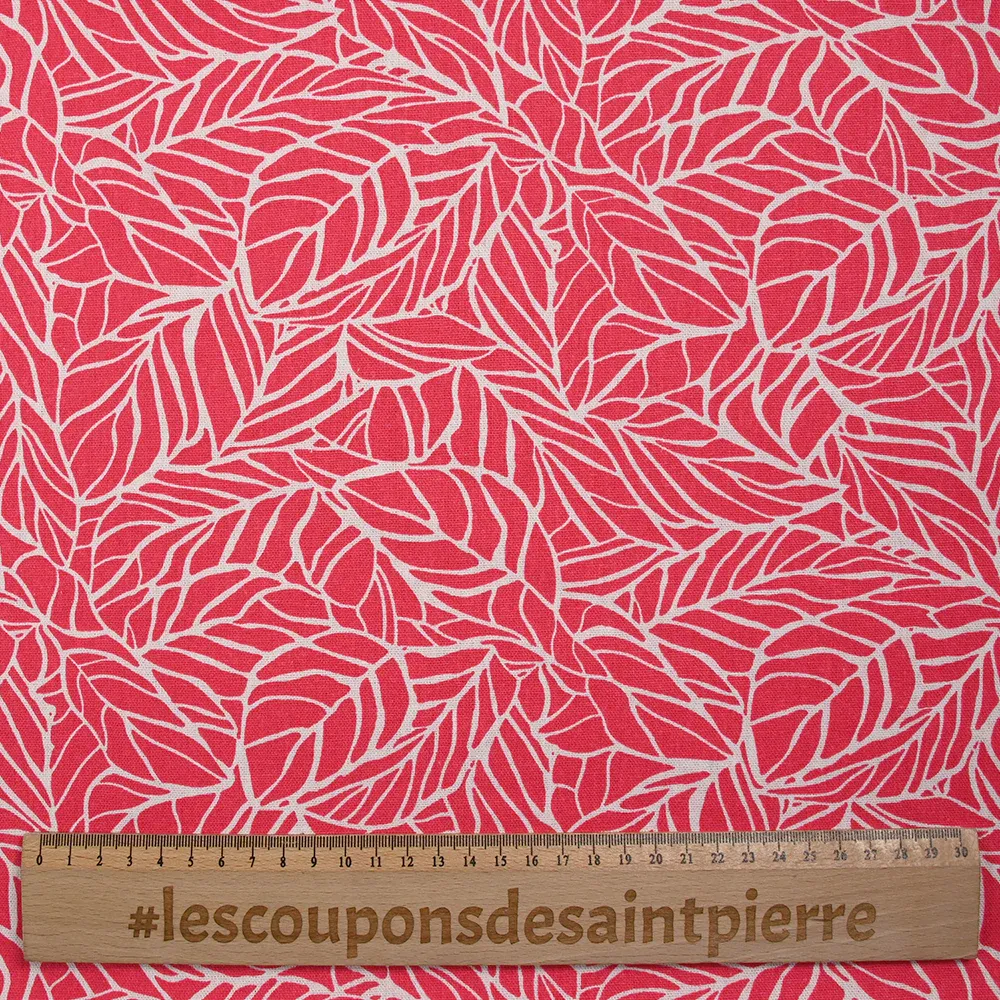 C’est un tissu composé de Lin et viscose de très belle qualité, assez fin et souple avec un motif de feuilles sur fond corail, très sympa. Composé de 70% de viscose et 30% de lin.