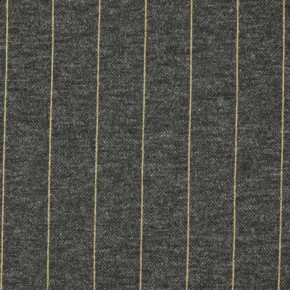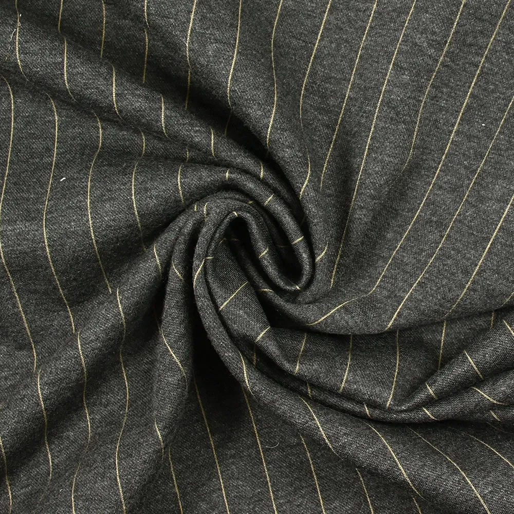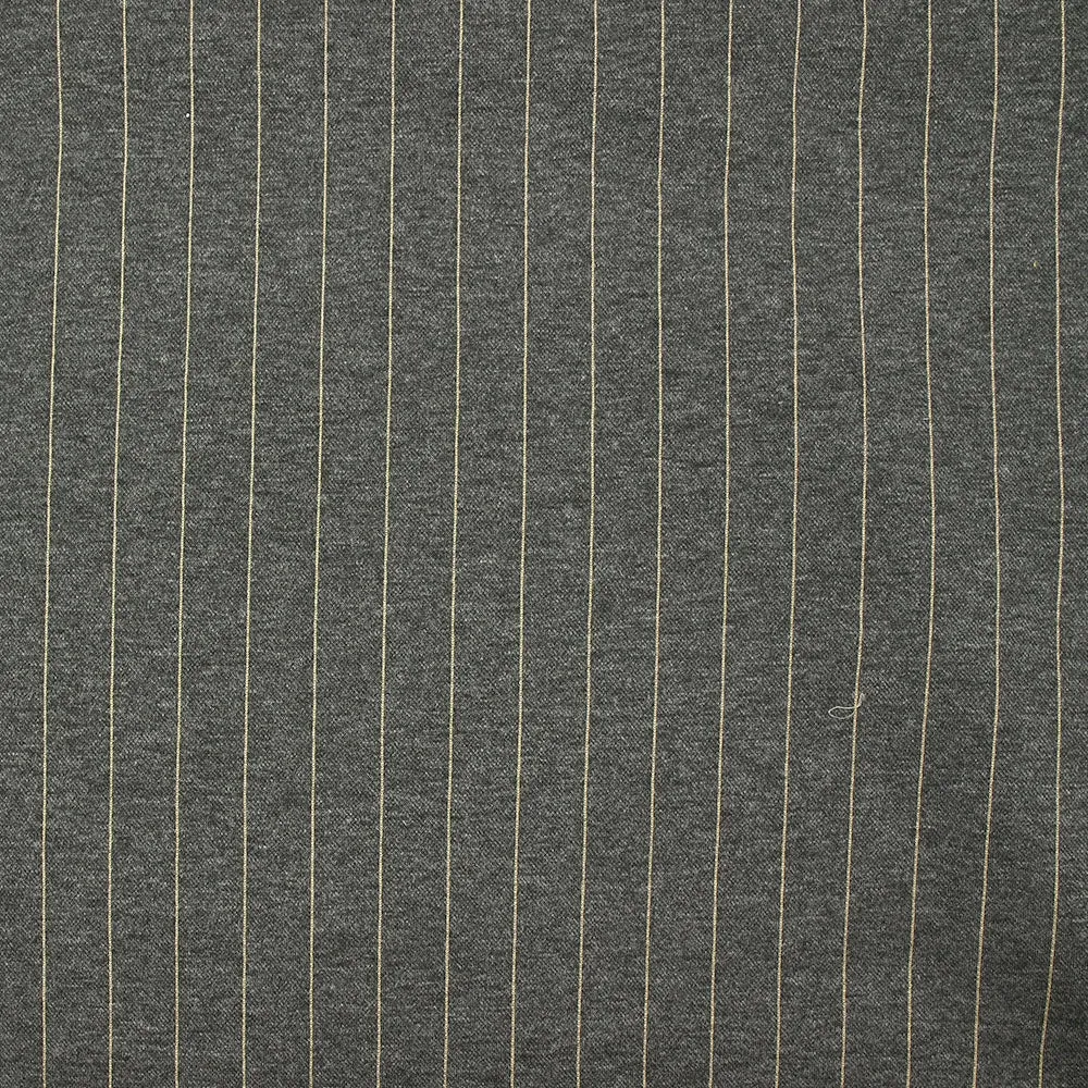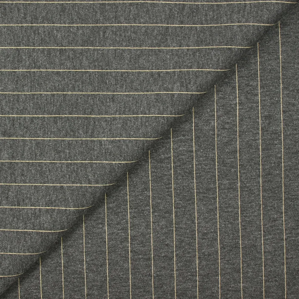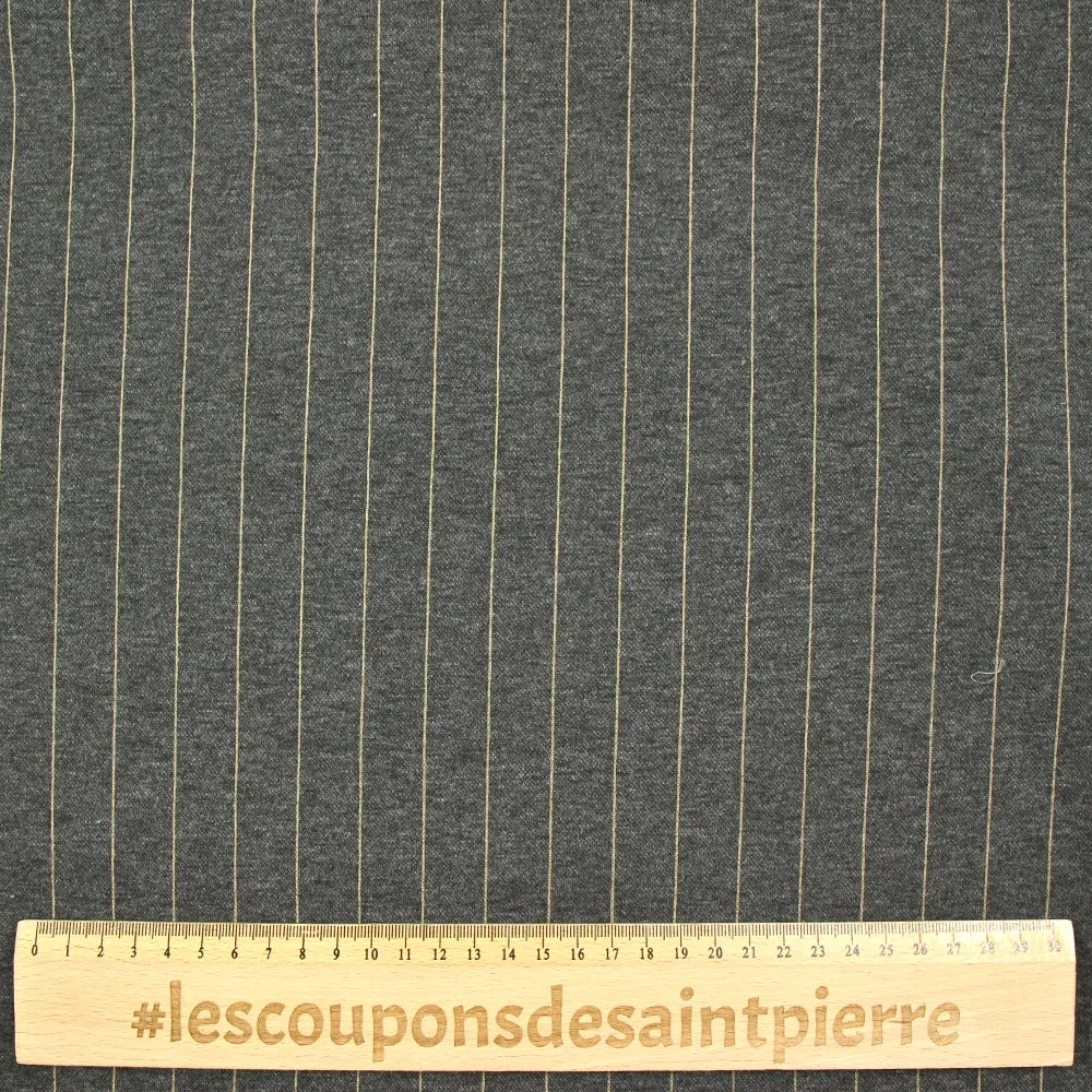 C’est une superbe maille composée de polyester avec un motif rayé sur fond gris. Maille lourde, souple avec un joli tombé.
