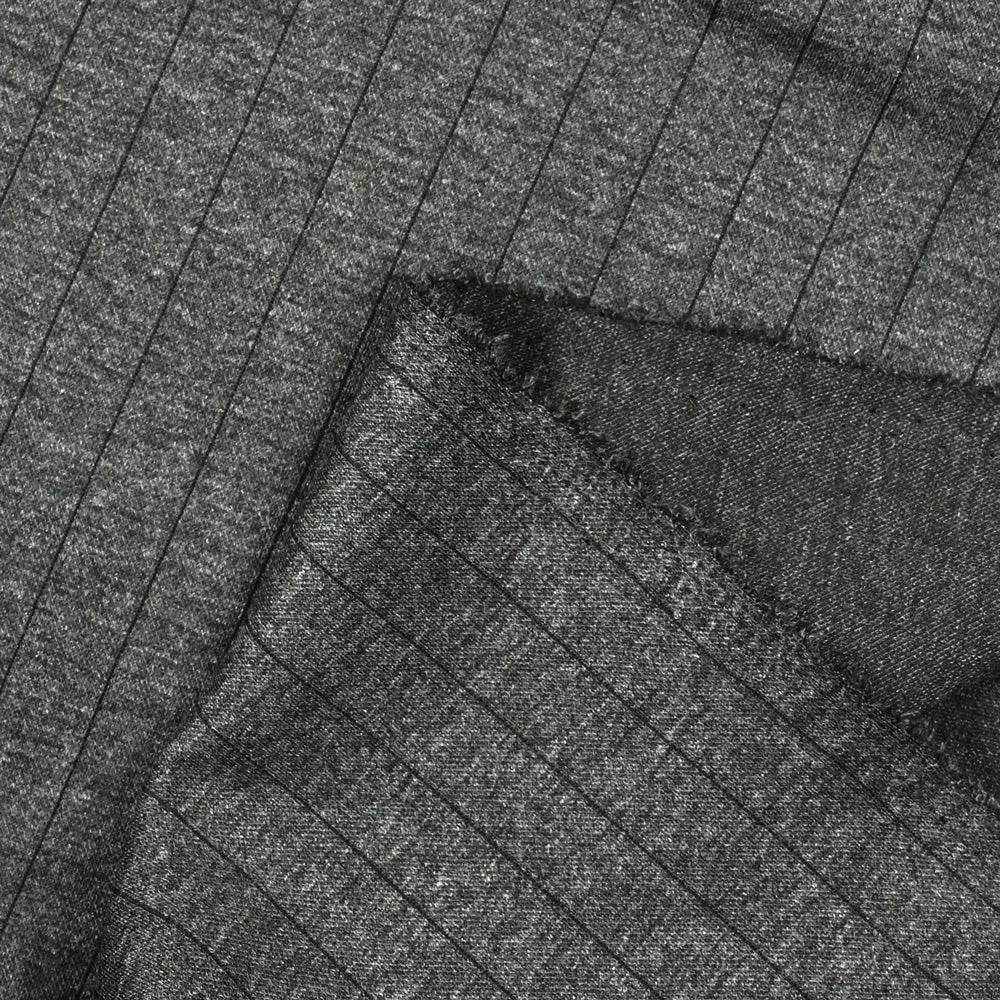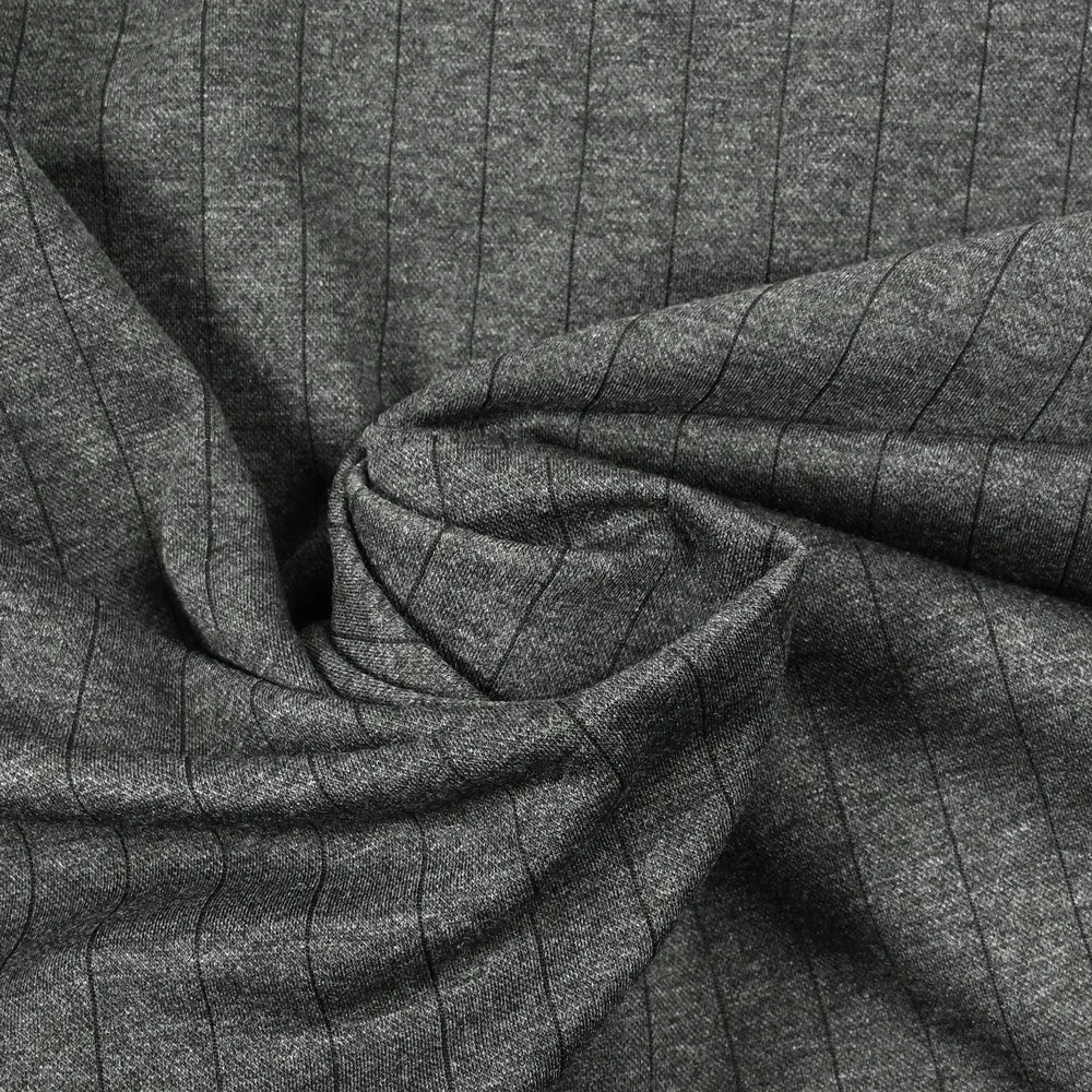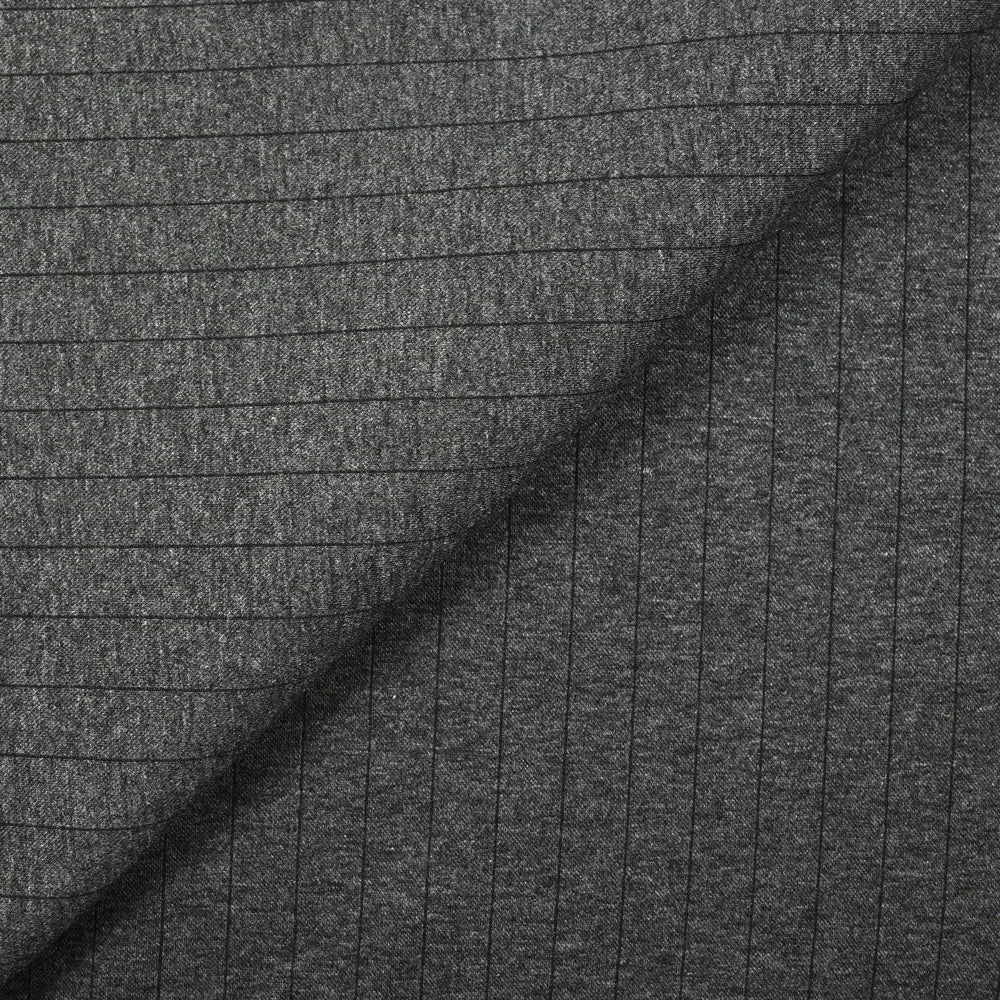 C’est une superbe maille composée de polyester avec un motif rayé sur fond gris. Maille lourde, souple avec un joli tombé.