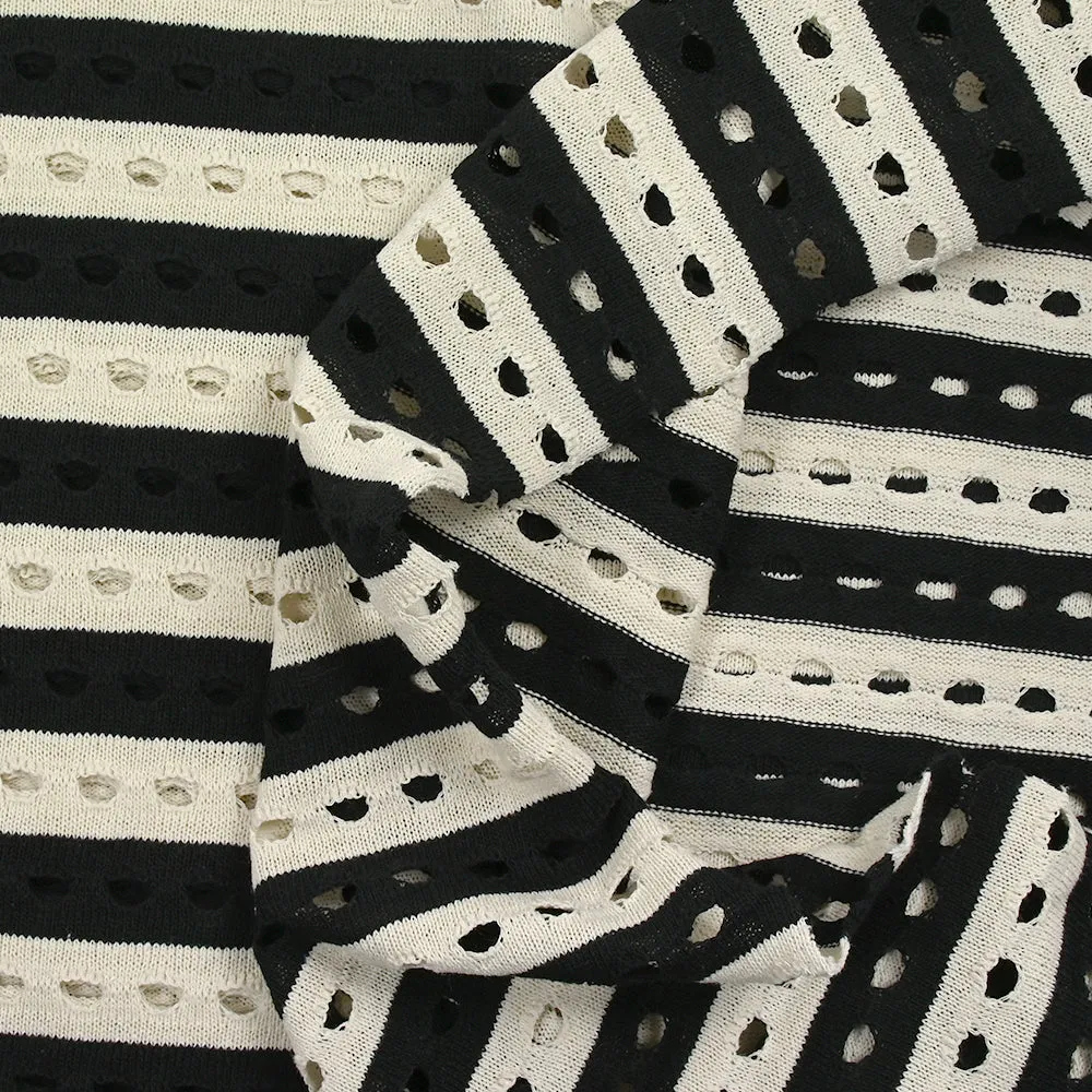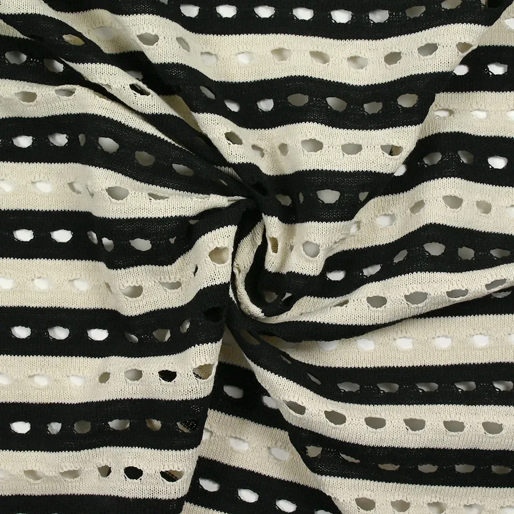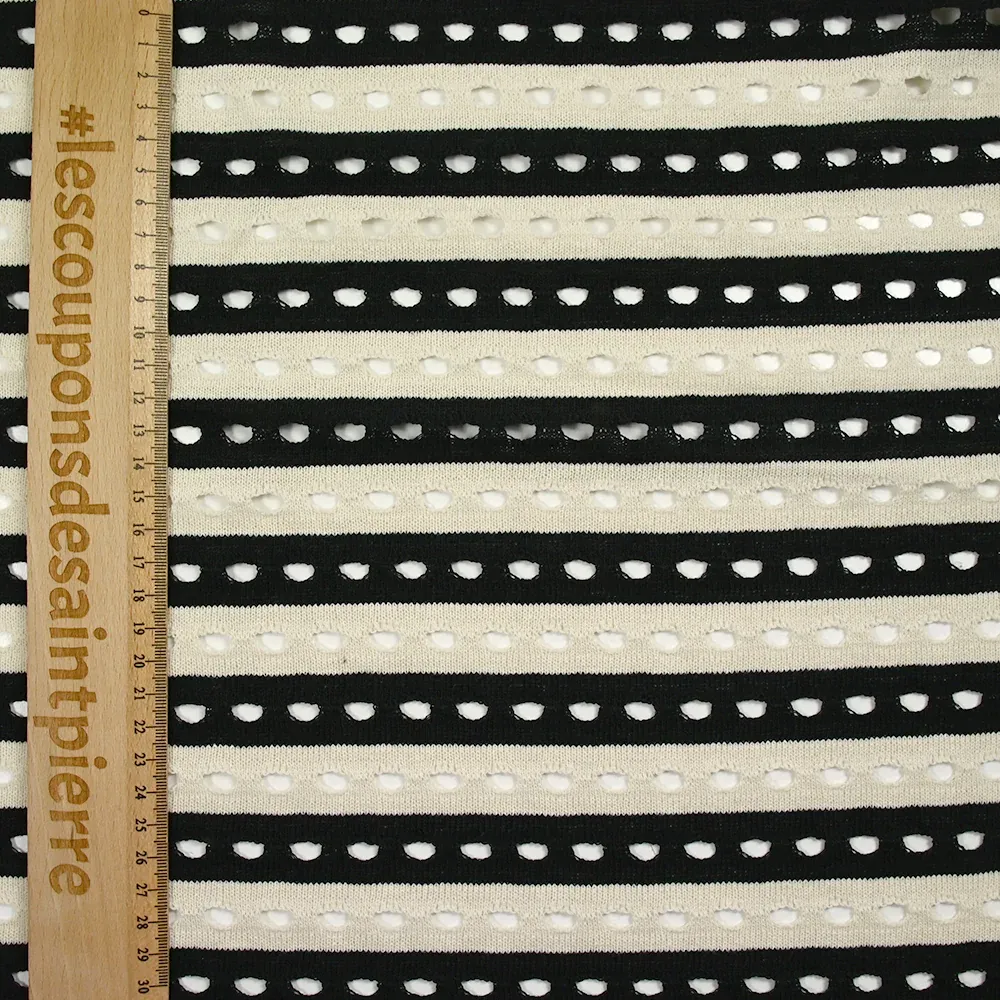 Très jolie maille composée de polyester. C’est une maille avec une belle épaisseur mais au tissage assez lâche, de poids moyen, souple, texturée par ses motifs ajourés, avec de la transparence, et extensible.