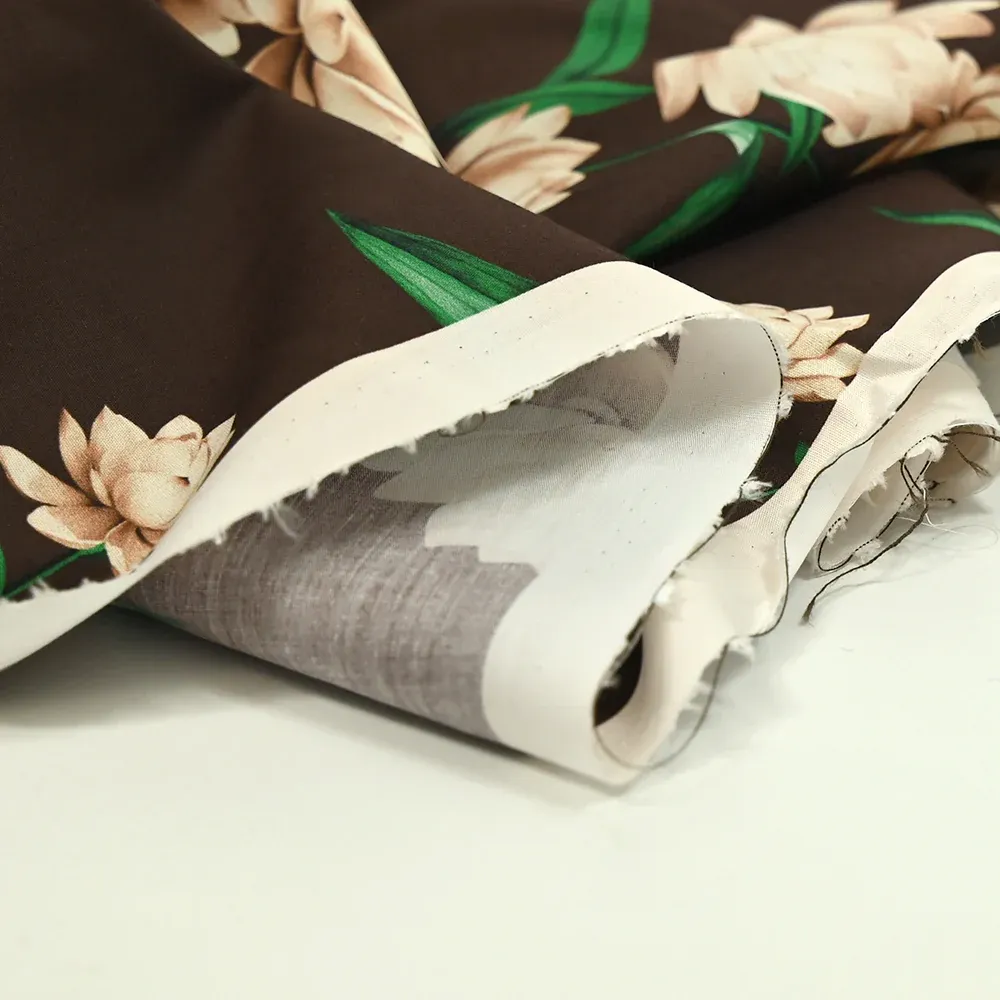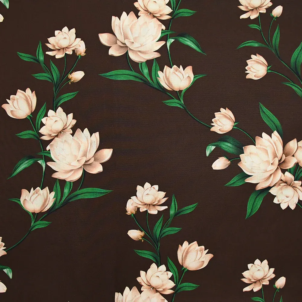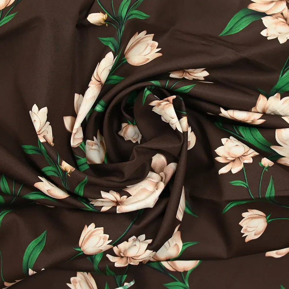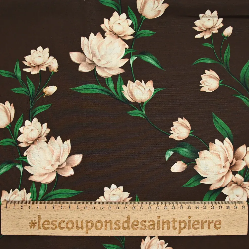 Popeline de coton imprimée fleurs sépia fond marron