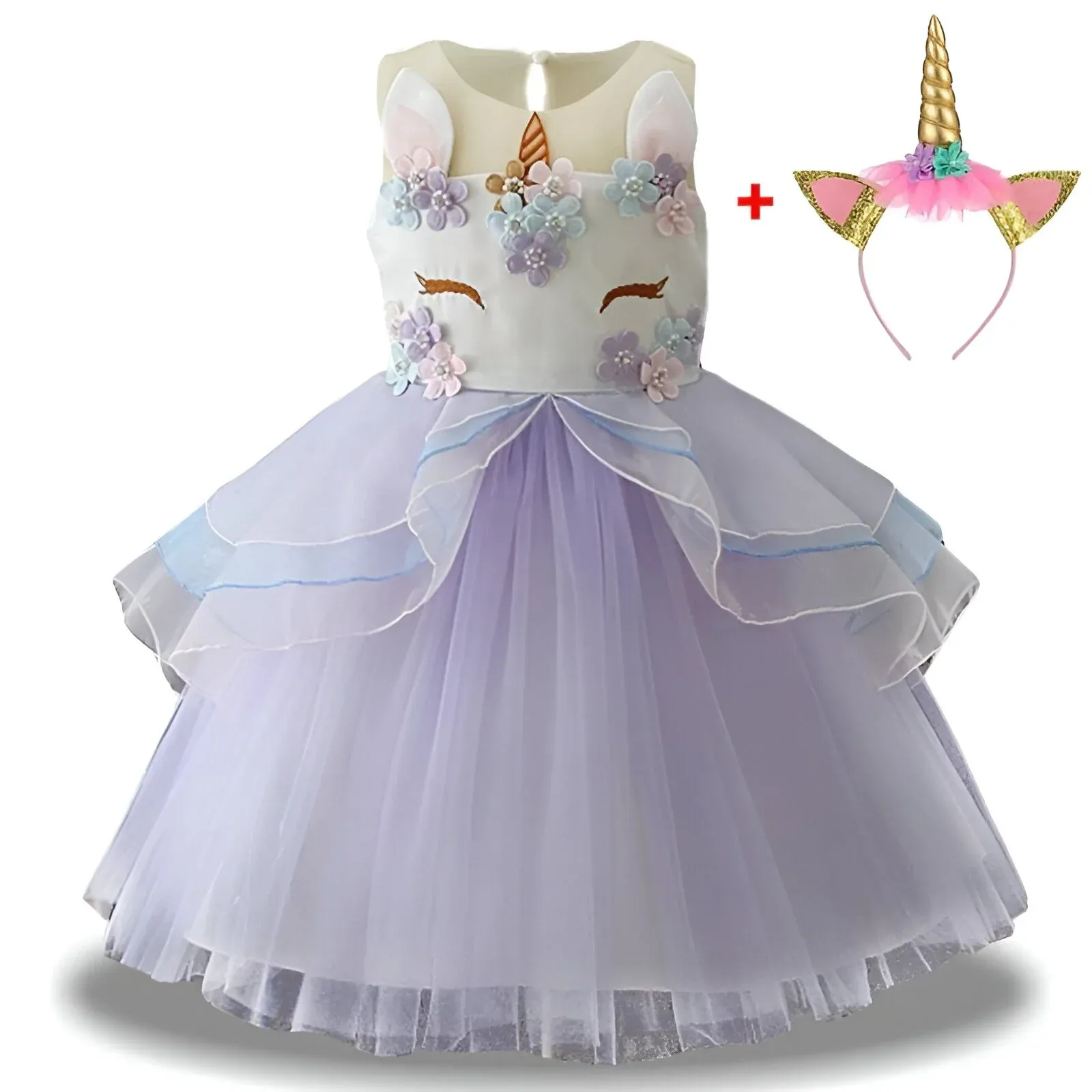 Pour les petites rêveuses, cette robe licorne violette est un véritable enchantement. Avec sa tête de licorne ornée de fleurs brodées, son tutu gracieux et son serre-tête doré assorti, elle transformera votre enfant en une princesse étincelante.