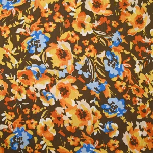 Mousseline crinkle satinée tableau de fleurs jaunes et bleues fond marron