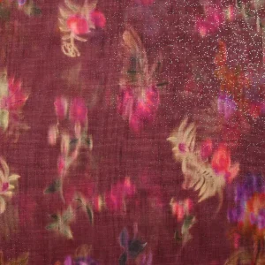 Mousseline imprimée à paillettes nuances de roses fond lie de vin