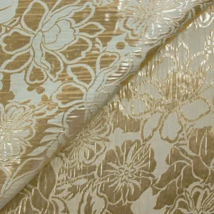 C’est un tissu composé de polyester et de fils Lurex dorés qui apportent une belle brillance et un côté chic très élégant et raffiné. Ce brocart est de poids léger, texturé par ses fils métallisés, très souple, fin, à l’aspect gondolé par son tissage et résistant.