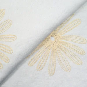 C’est un tissu crêpe composé de 87% de viscose et 13% de polyamide avec des motifs brodés en relief. Tissu de poids moyen, souple avec une très légère transparence.