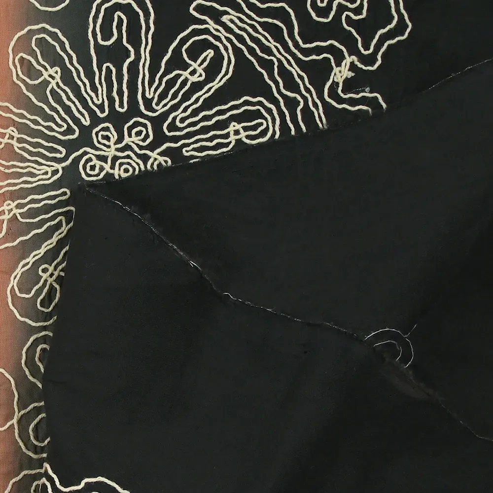 Le tissu a une base brodée (sur environ 25 cm de largeur pour la partie brodée et 42 cm environ pour le fond en dégradé noir/pêche) tout le long des deux laizes. Le reste du tissu est une partie blanche (sur environ 60 cm).