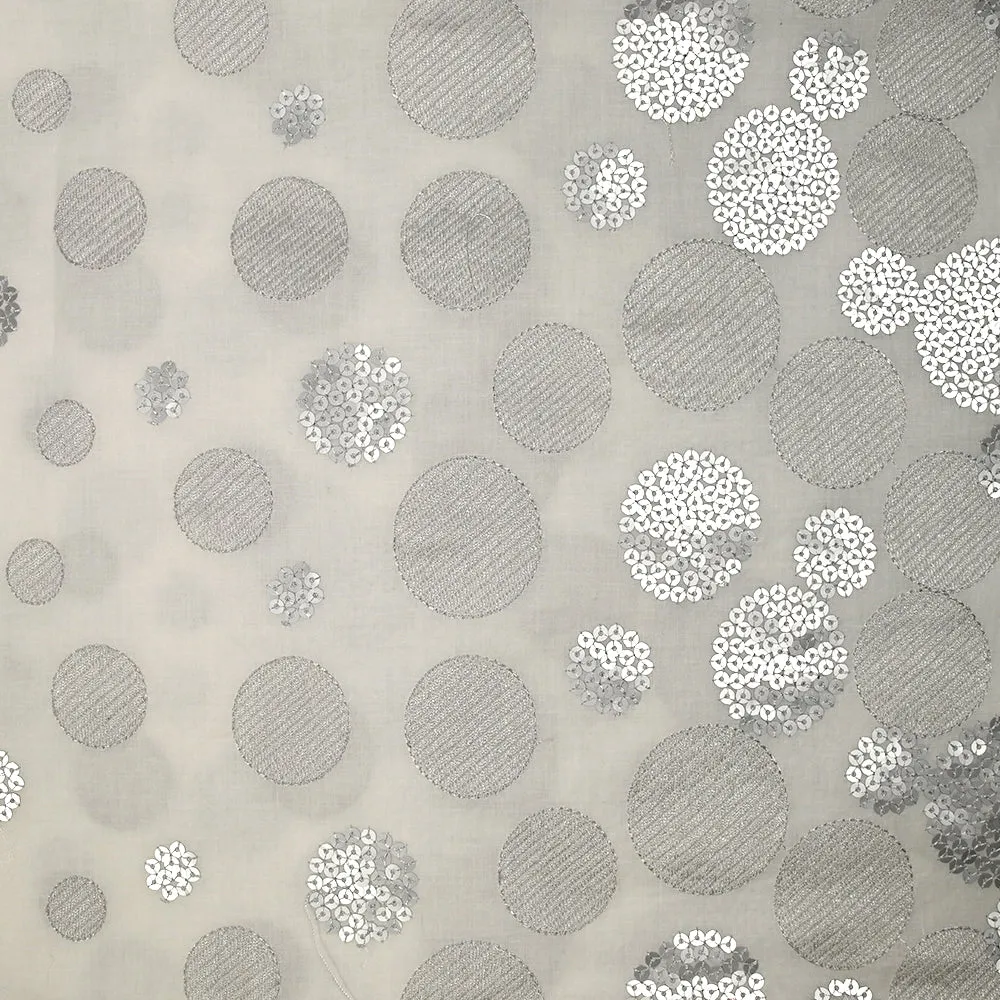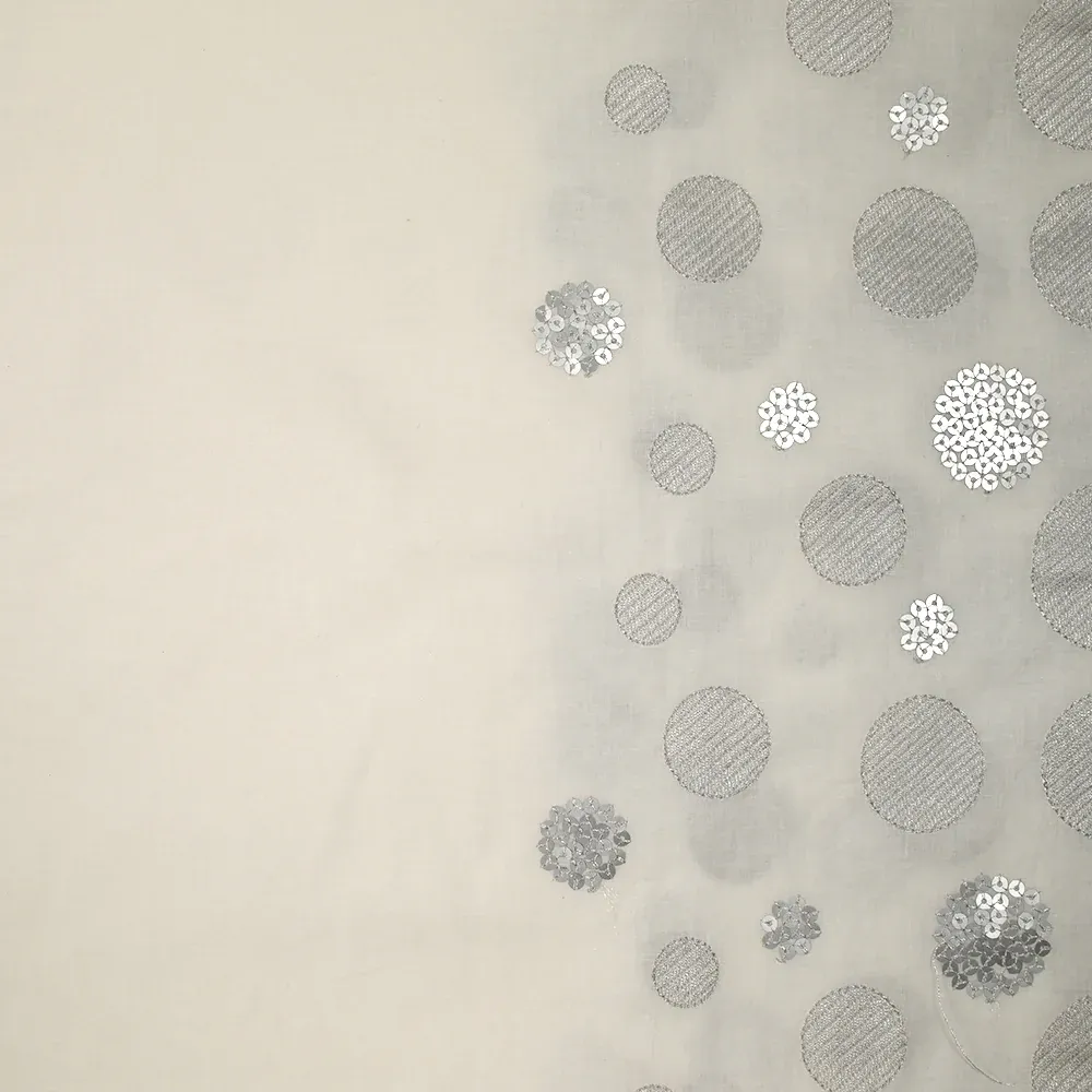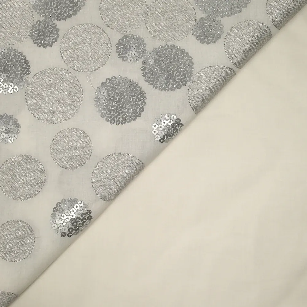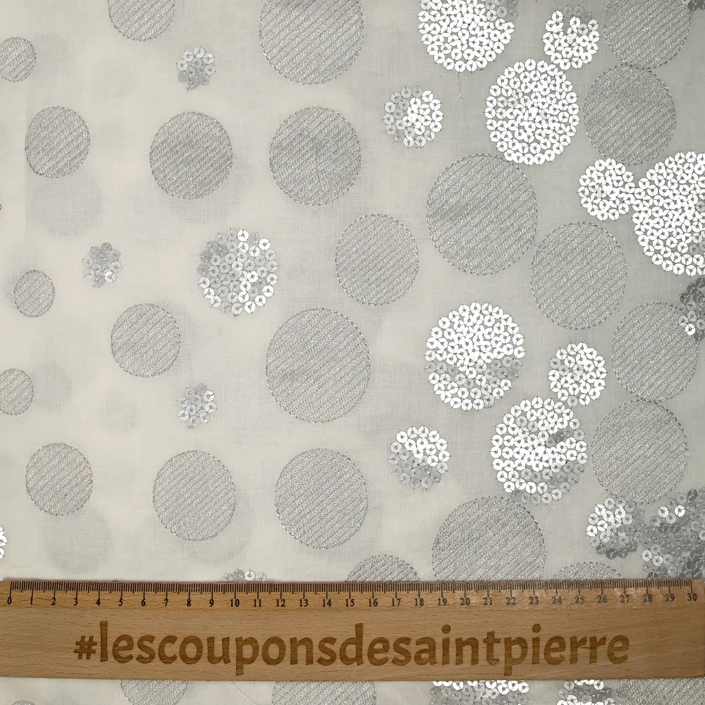 Voile composé de coton de super qualité avec un motif de cercles brodés et à sequins argentés. C’est un tissu fin, léger et souple avec de la transparence.