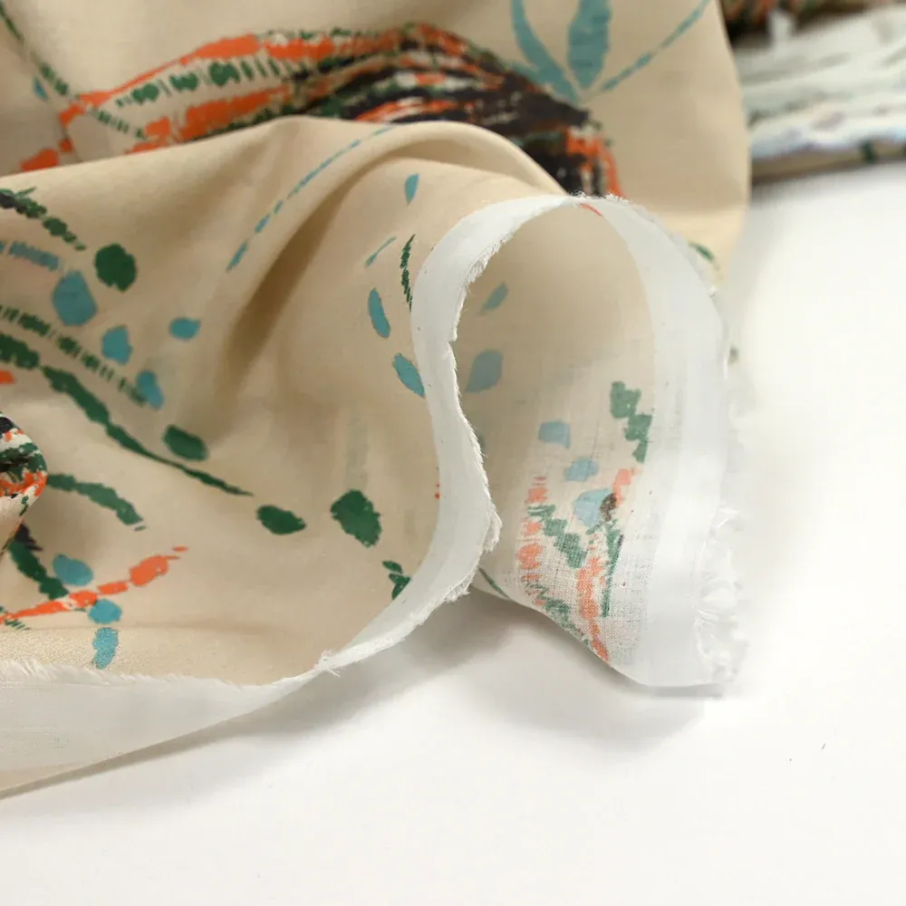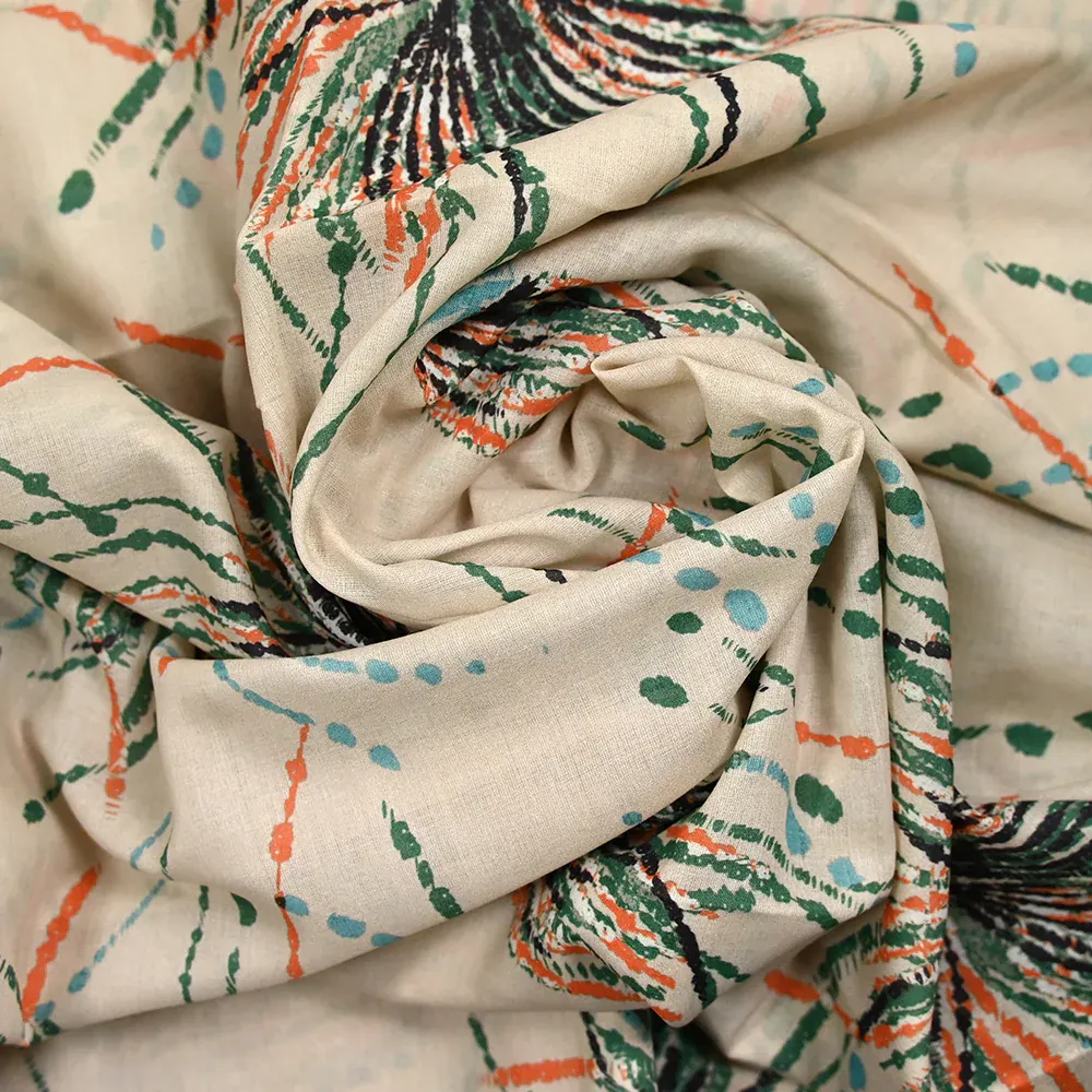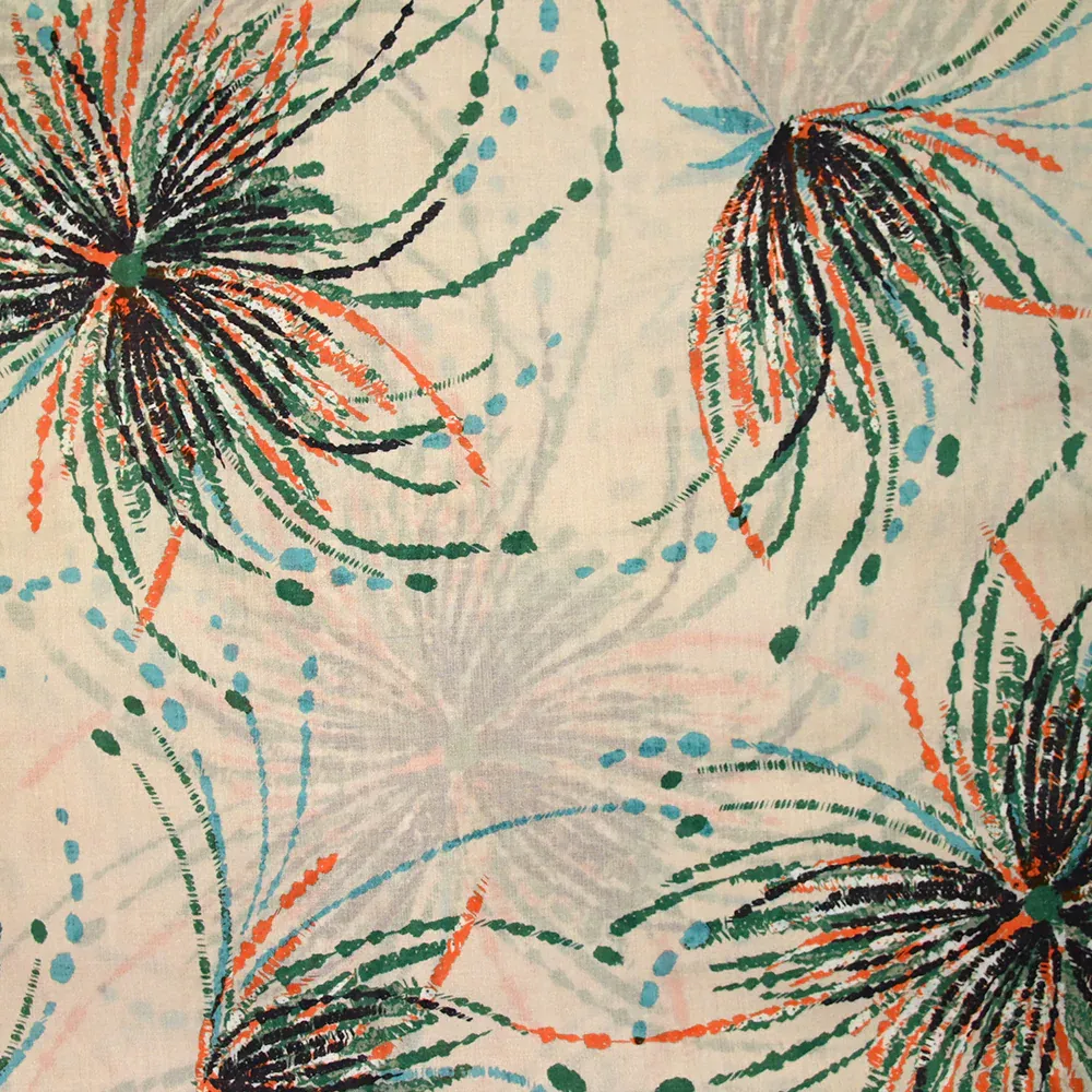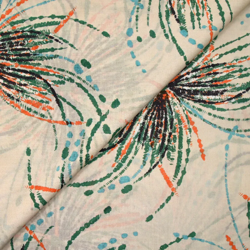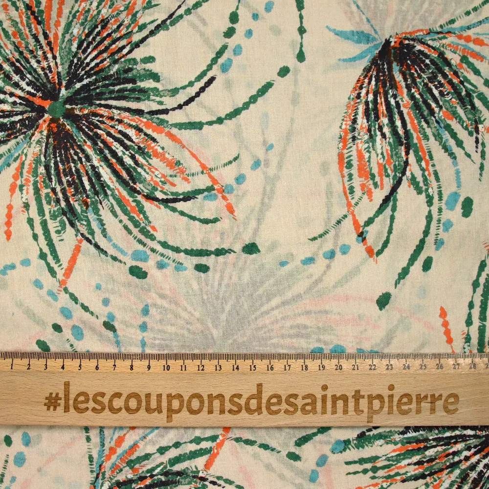 Voile de coton imprimé pissenlit vert et orange fond beige